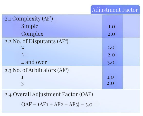 The arbitrator’s fees shall consist of a Base Amount (“BA”) plus adjustments to reflect, among others, complexity of the case, number of disputants and number of arbitrators. The arbitrator’s fees will be separately assessed for the claimant, respondent and other parties on the basis of their respective claims, counterclaims or affirmative reliefs in accordance with the Rules.